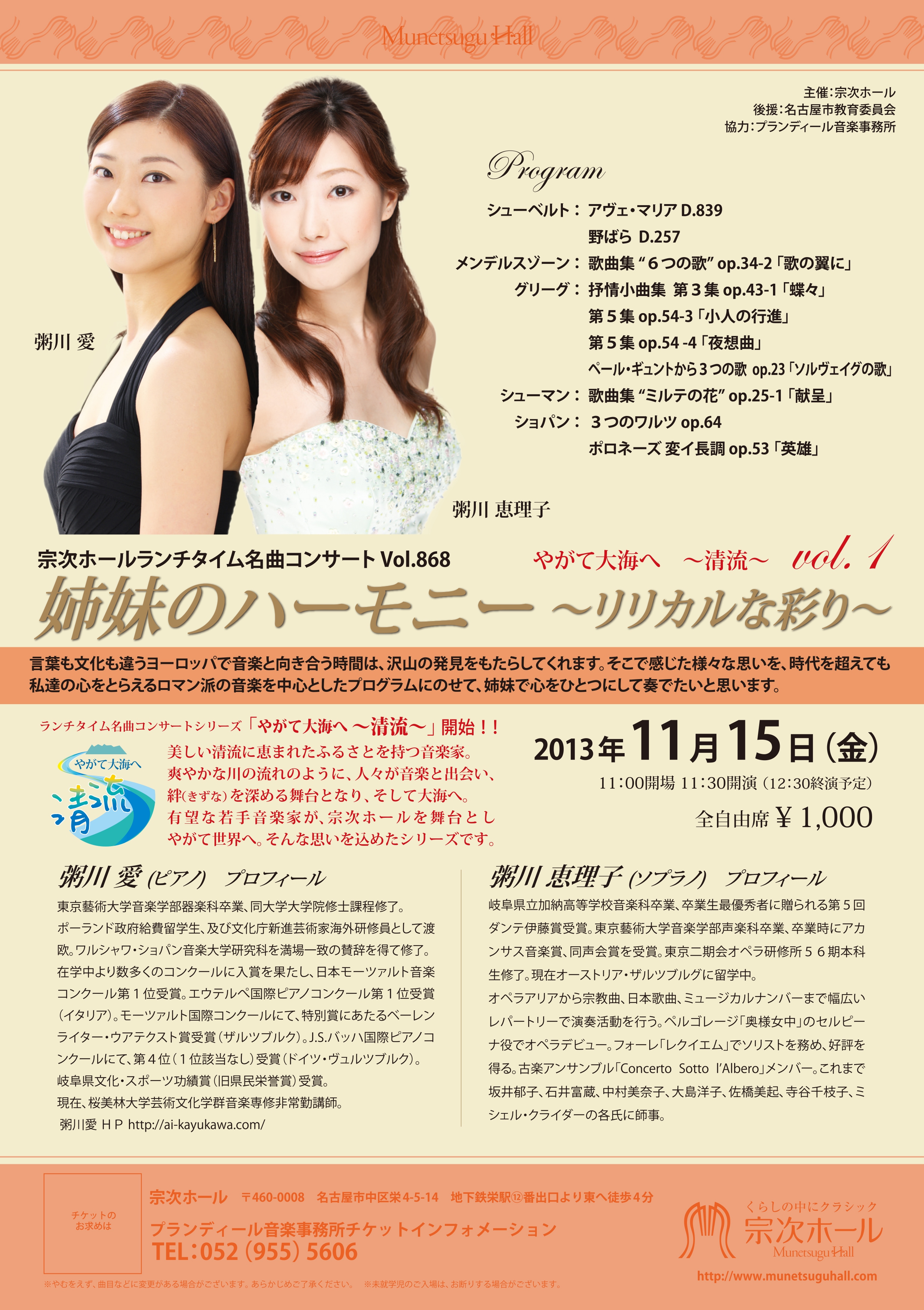 宗次ホールのランチタイムコンサートに岐阜県の若手音楽家によるシリーズ「やがて大海へ ~清流~」が始まりました。その第1回目に姉妹で出演させて頂きます。久しぶりの名古屋での姉妹共演、珠玉の作品たちを心を込めて演奏したいと思います。お近くの方は是非聴きにいらして下さい。