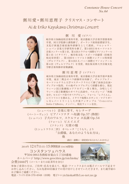 岐阜県各務原市にあるコンスタンツェハウスにて、姉妹でクリスマスコンサートに出演致します。