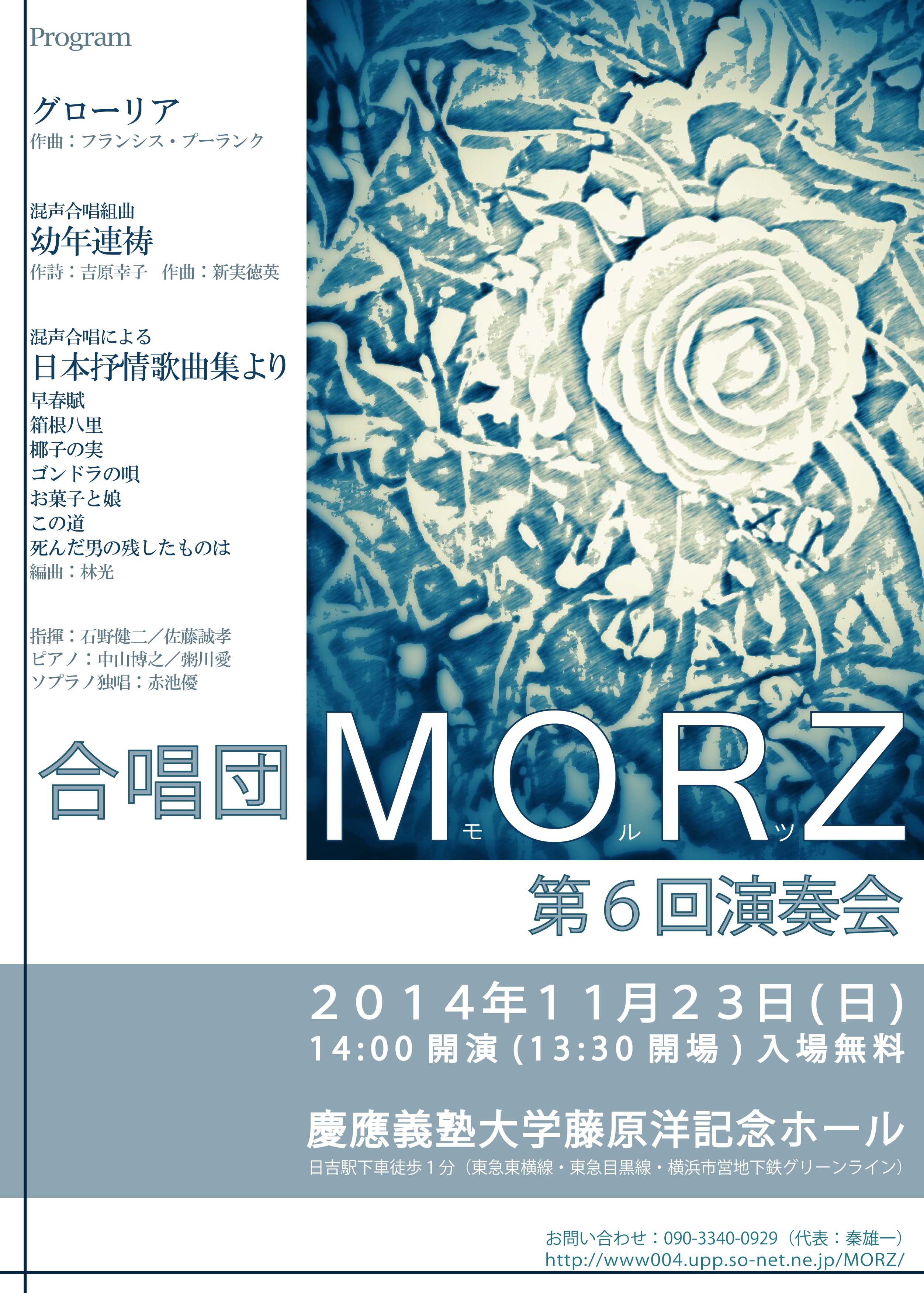合唱団MORZ(モルツ)さんの第6回演奏会に出演致します。混声合唱の魅力、団員さんの熱意の感じられるプログラムでもあり、私も共演が楽しみです。曲によっては伴奏というよりピアノ協奏的な要素を持つ音楽になっています。無料のコンサートですのでお近くの方は是非聴きにいらしてください。
