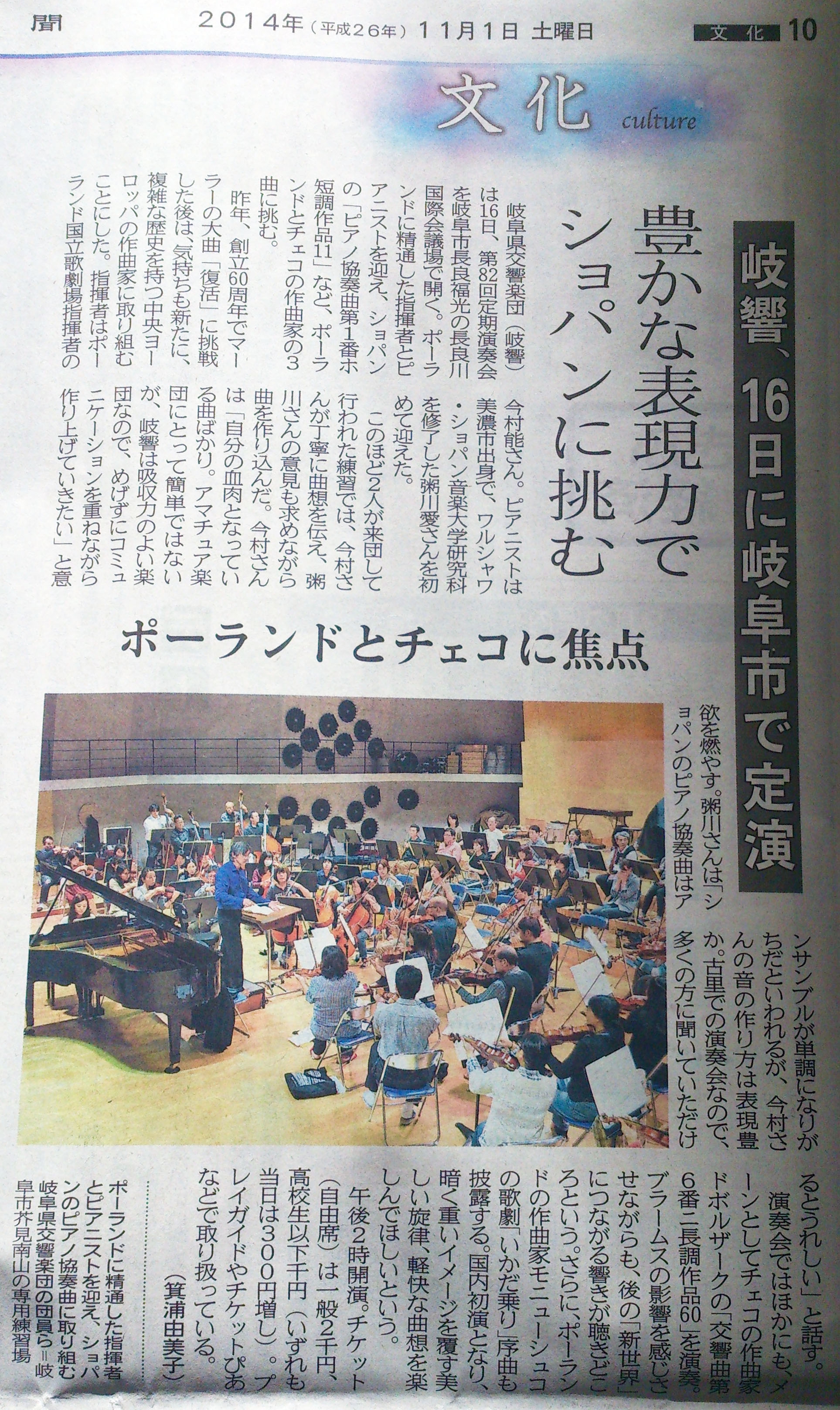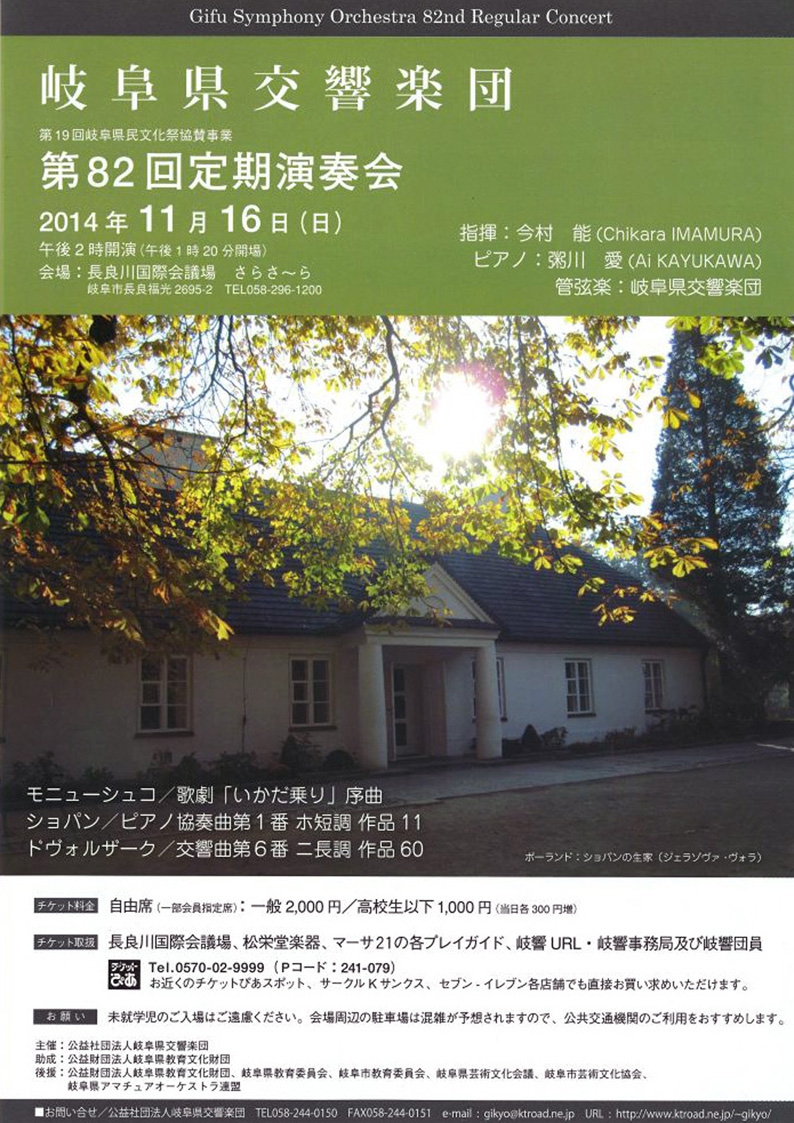 岐阜県交響楽団さんとショパンのピアノ協奏曲ホ短調を演奏いたします。ワルシャワで学んだショパンを、ポーランドにゆかりのある今村先生と演奏できることも楽しみです。ショパンの心に近付けるようピアノに向かいたいと思います。