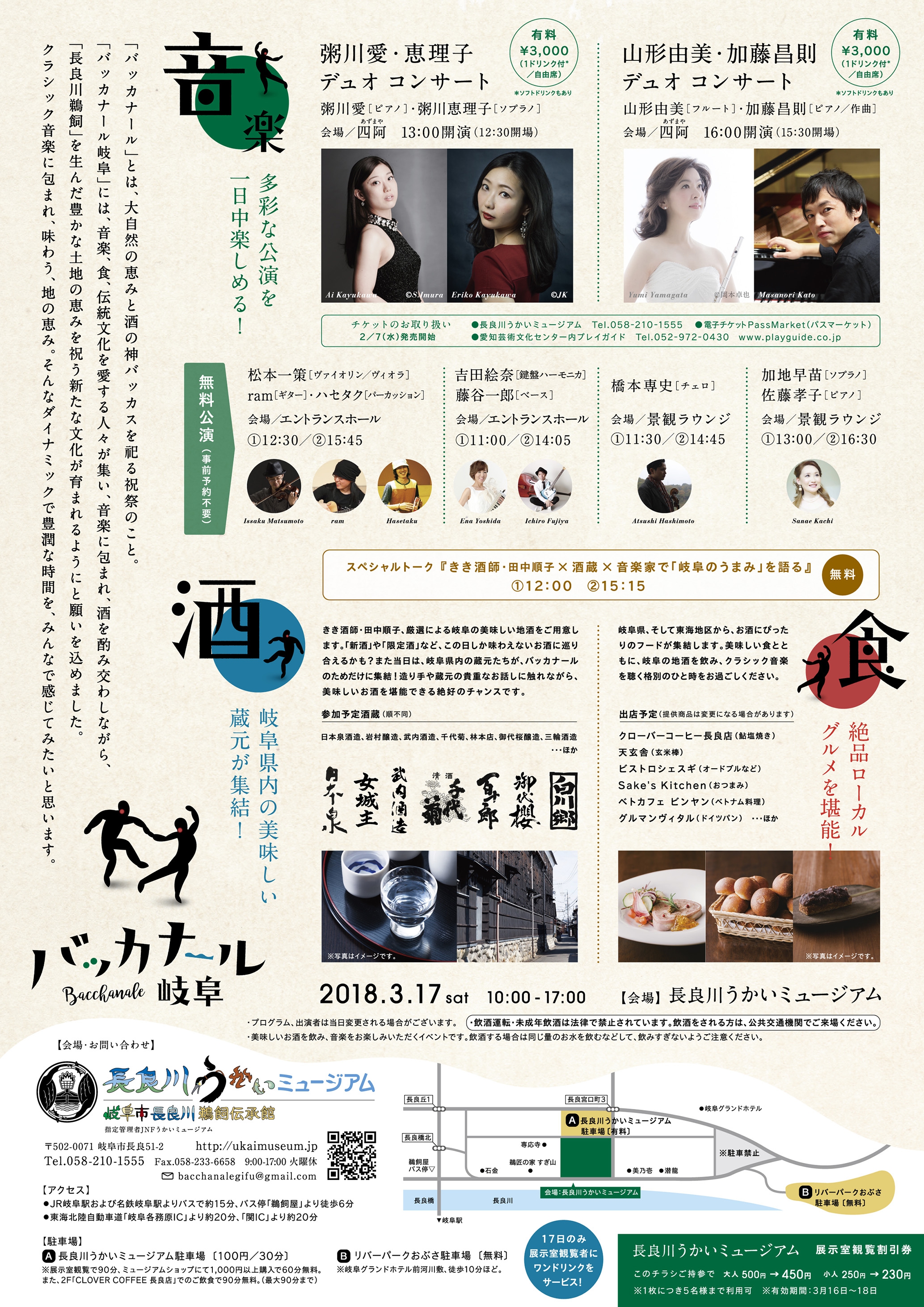岐阜の長良川うかいミュージアムにて、バッカナール音楽祭に姉妹で出演します。姉妹での久しぶりのコンサートは、この季節にぴったりの、うつくしい水と春をテーマにプログラミングしました。ワンドリンク付きのコンサートで、岐阜県内の美味しい蔵元さんや、グルメのお店なども出店します。ラウンジやエントランスでも、1日中多彩な公演を楽しめます。金華山や長良川をのぞむミュージアムにて、音楽の春のひとときを過ごしに是非いらしてください。
