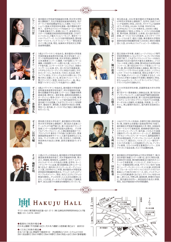 磯野正明(Vc.), 北村一平(Cb.), 樋口裕香(Fl.), 石橋力(Ob.), 大成雅志(Cl.), 田中拓也(Sax.)