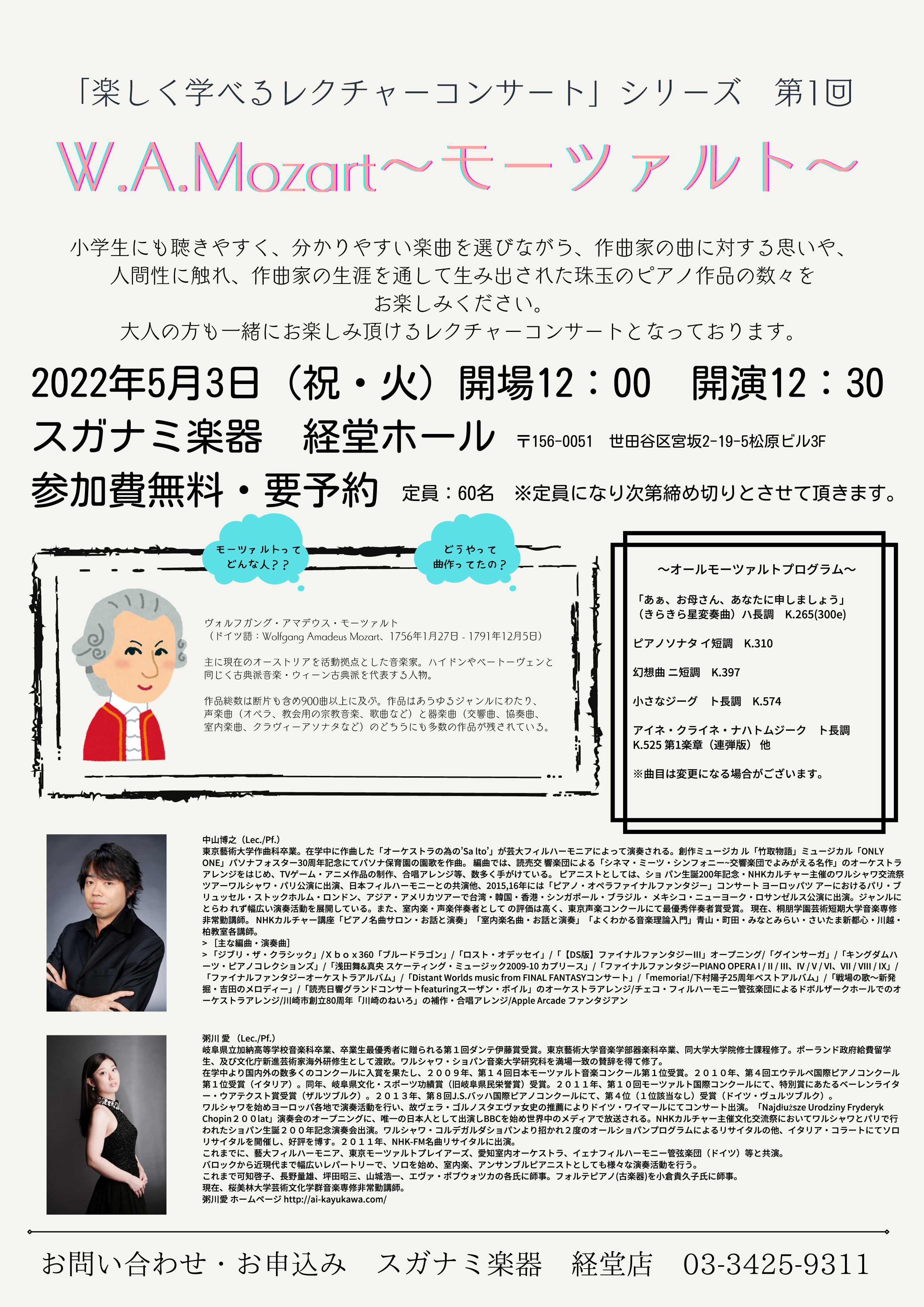 スガナミ楽器の経堂ホールにて、楽しく学べるレクチャーコンサートシリーズに出演します。第1回のテーマはモーツァルト。モーツァルトの作品たちが、なぜ名曲なのか、小学生から大人まで幅広く楽しめる解説を交えながら、大好きなモーツァルトの作品の数々を演奏したいと思います。