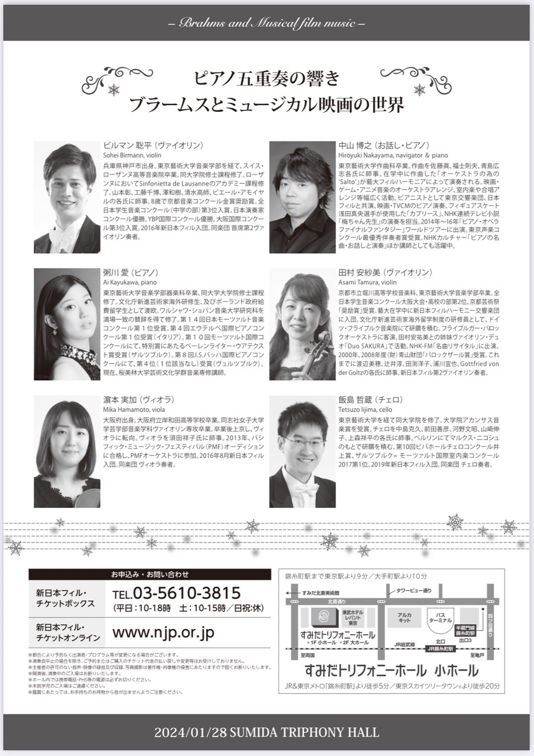 新日本フィルハーモニー交響楽団の皆さまと、昨年に引き続き室内楽で共演します。今年はブラームスのピアノ五重奏曲。後半はこの日の為に特別編曲された楽曲をお楽しみください。