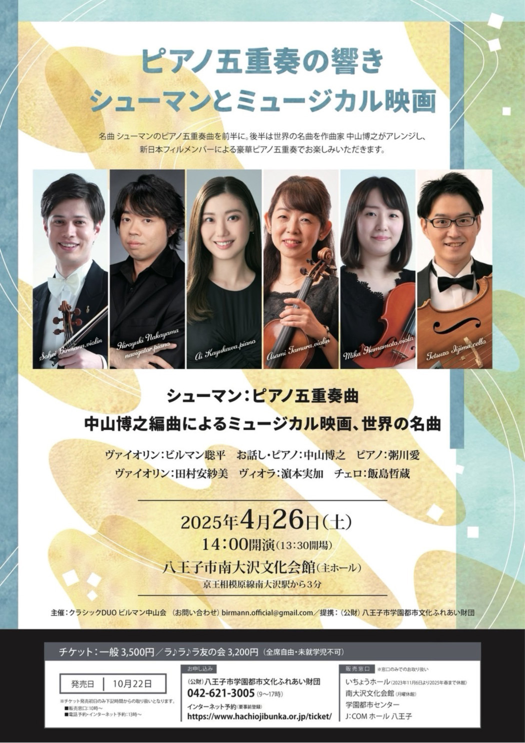 今年は2回公演で、シューマンのピアノ五重奏をお馴染みの素敵なメンバーと共演させていただきます。後半は中山博之氏編曲によるミュージカル映画の名曲をたっぷりと。